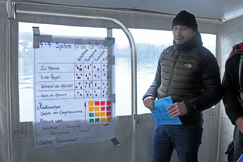 Vorgängig zur Tauchlehrertagung fand bereits am Samstag, 11. Januar 2020 ein Tauchgang mit der Kon-Tiki inkl. Instruktion des neuen Tauchgangplanungs-Hilfsmittels 4x4 statt.