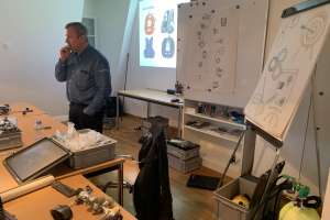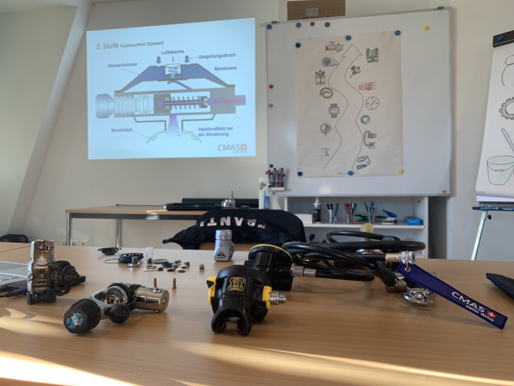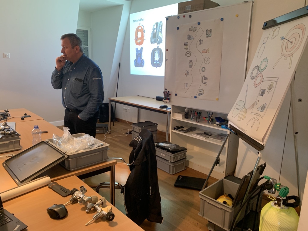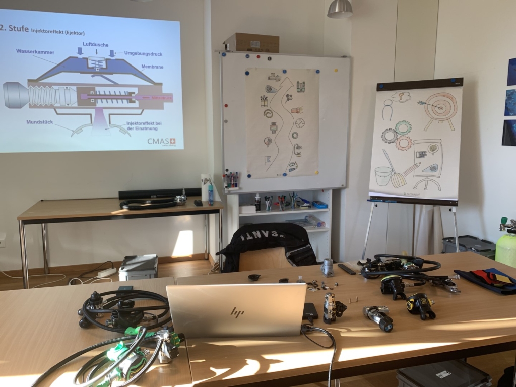 Am Nachmittag verwandelte sich der Theorieraum in ein Tauchmuseum und damit startete das Modul D. Christoph, ein wandelndes Tauchlexikon, erklärte uns ausführlich die verschiedenen Tauchutensilien und brachte uns mit alten Tauchcomputern zum Staunen. Zusätzlich versuchten wir uns als Wiederholung beim Zeichnen von 1. Stufen, was wir sicherlich auch nochmals in Ruhe üben sollten. Durch das viele Anschauungsmaterialien und die geduldigen Erklärungen von Christoph konnten wir unser Wissen erweitern und Unklarheiten klären.