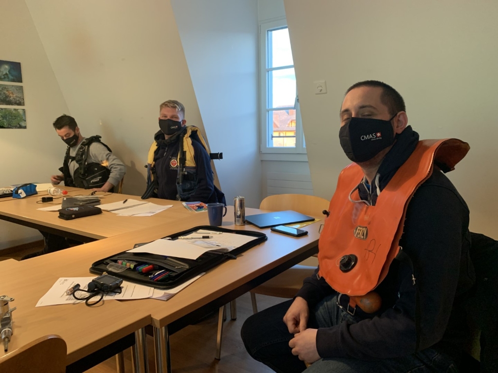 Am Morgen begann das Modul A, wo wir zusammen mit Mike die drei Webseiten CMAS.CH, MyCMAS und Therorieprüfungen.CMAS.CH durchstöberten. Er präsentierte diese unter den wachsamen Augen von Guido um seinem Ziel, ein TL I3 zu werden, näher zu kommen. Dabei wurde uns die Organisation CMAS genauestens erklärt und das vorhandene Wissen vom D3 Kurs nochmals abgefragt. So wurde uns allen schnell klar, dass wir noch die eine oder andere Stunde mit Theorie büffeln verbringen werden, damit wir an der Prüfung sattelfest sind.