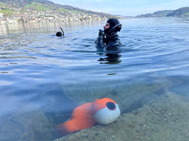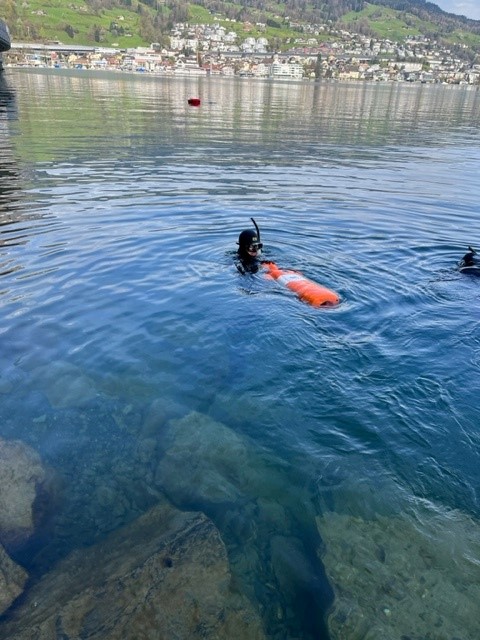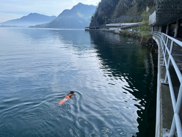 Heute standen die physischen Disziplinen auf dem Programm. Reto und ich schwammen und tauchten dabei beim Tauchplatz Lopper im Vierwaldstättersee auf und ab. Dies unter den wachsamen Augen von Franco Castronari an Land und Mike Jungi im und unter Wasser.