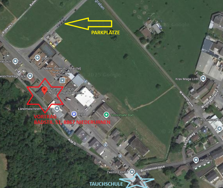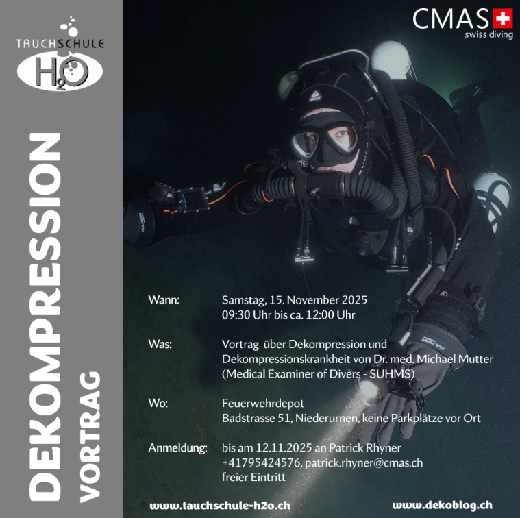 Dr. med. Michael Mutter (CMAS-I1 und Medical Examiner of Divers SUHMS) hält am 15.11.2025 in Niederurnen einen Vortrag rund um die «Dekompression & Dekompressionskrankheit». Geeignet für Taucherinnen und Taucher aller Brevetstufen. Aber auch «Nichttaucher» sind herzlich willkommen. Damit wir genügend Stühle bereitstellen können, bitte anmelden. Direkt beim Feuerwehrdepot darf nicht parkiert werden. Fahrzeuge können bei der Tauchschule und Umgebung abgestellt werden (siehe Übersichtsplan). Wir freuen uns auf eine tolle Weiterbildung.