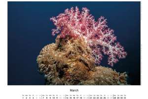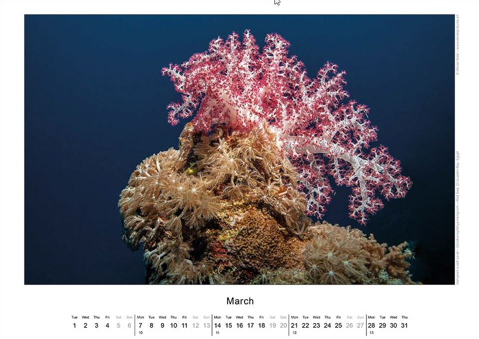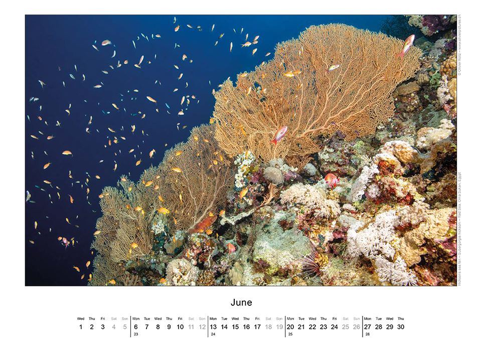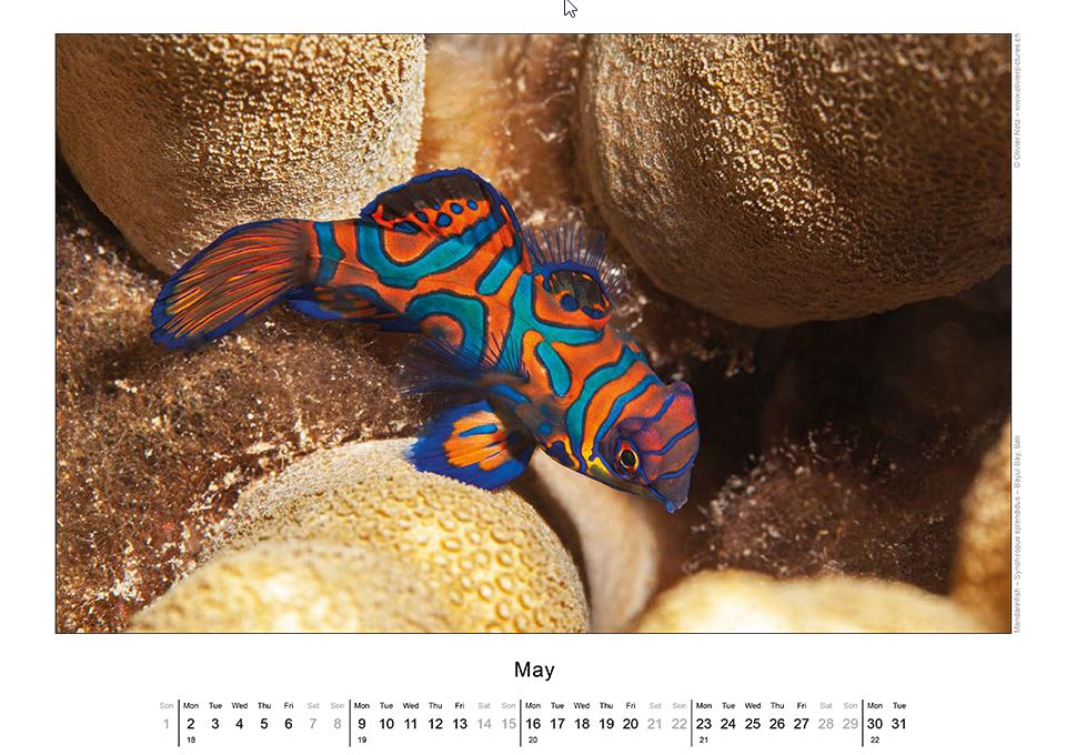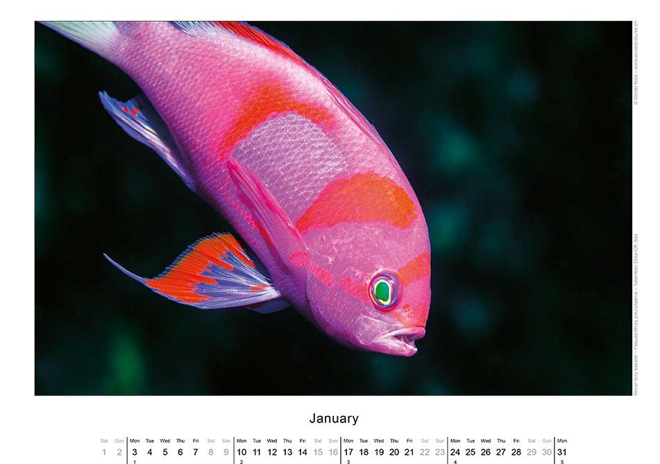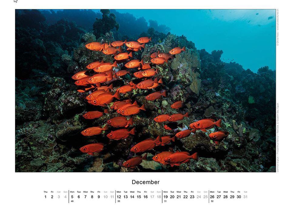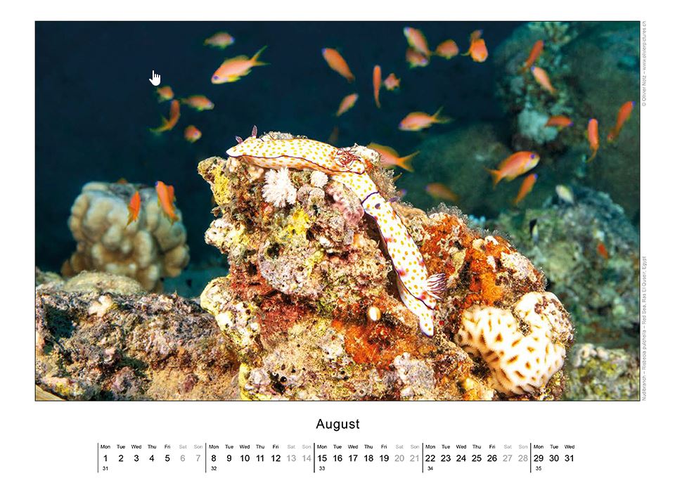 Calendario con nuove foto subacquee in grande formato d'Olivier Notz. Il calendario conta 13 pagine (copertina e 1 pagina per ogni mese) su carta brillante di 250g di dimensioni 48 x 23 cm, dorso in cartone da 600g e spirale bianca.