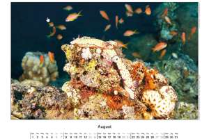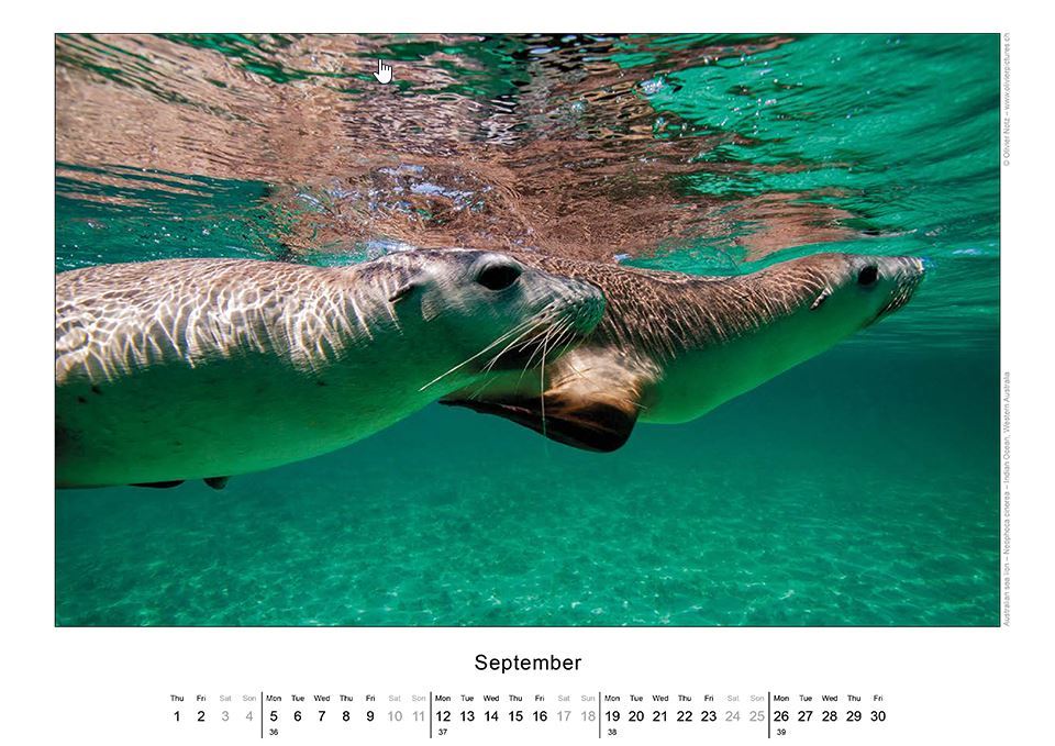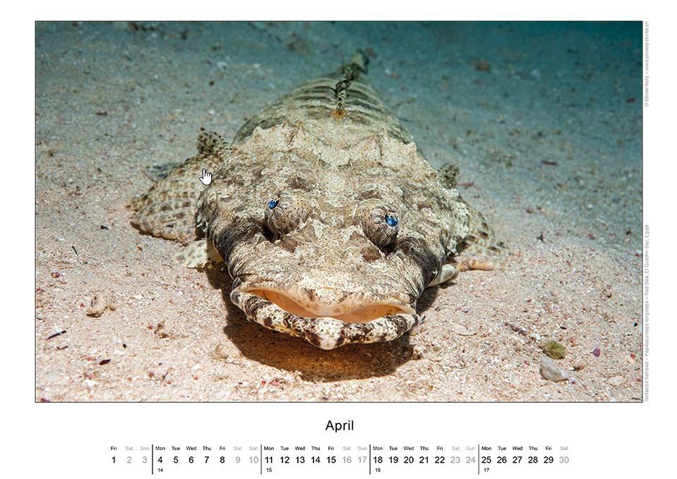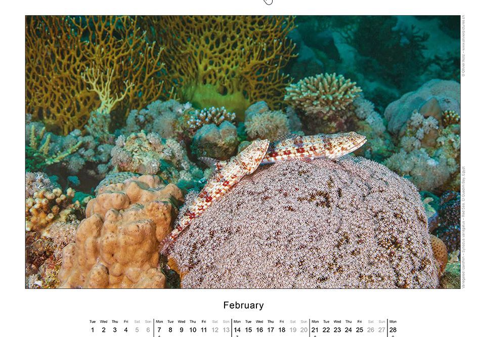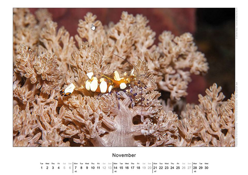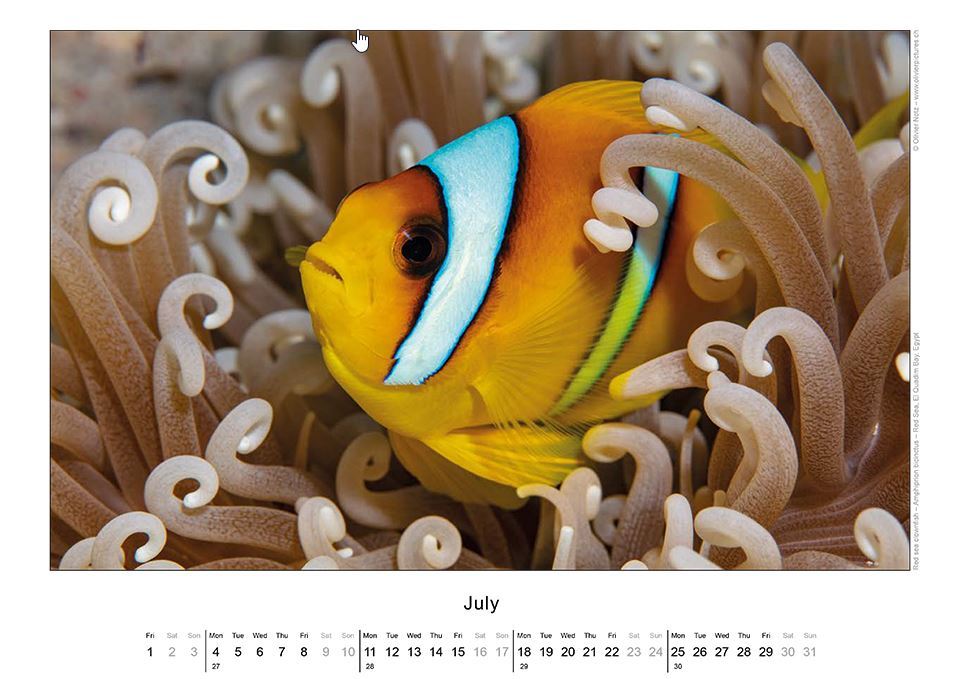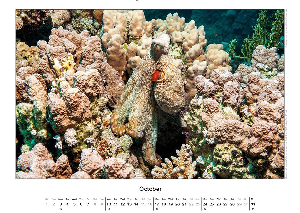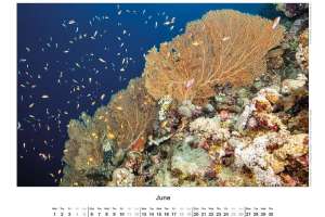 Calendario con nuove foto subacquee in grande formato d'Olivier Notz. Il calendario conta 13 pagine (copertina e 1 pagina per ogni mese) su carta brillante di 250g di dimensioni 48 x 23 cm, dorso in cartone da 600g e spirale bianca.